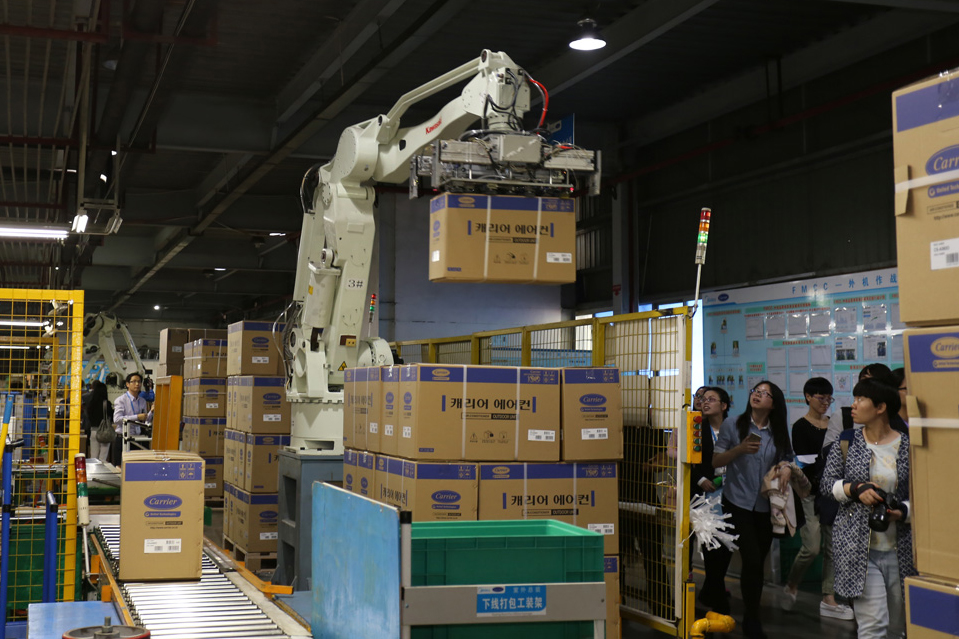 現(xiàn)在的空調(diào)生產(chǎn)線,出現(xiàn)的已不再是擁擠忙碌得跟陀螺似的產(chǎn)業(yè)工人。因?yàn)椴簧俚?span lang="EN-US">“機(jī)器手”、“機(jī)器人”的出現(xiàn),勞動密集型的家電制造工廠被賦予了全新的“科技感”和“智能化”的色彩。在空調(diào)室內(nèi)、外機(jī)總裝線體的末端,裝箱、打包等繁重環(huán)節(jié),早已被機(jī)器人所取代。當(dāng)成品從生產(chǎn)線上完成之后,也是通過機(jī)器手直接搬運(yùn)到流轉(zhuǎn)板上。